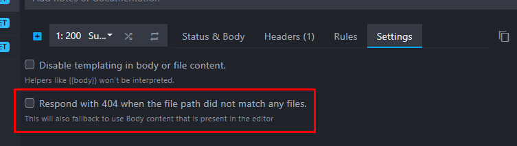 A new option has been added to the route response to automatically send a 404 status when a file was not found. This option only overrides the status code and will revert to serving the body present in the editor instead of the file.