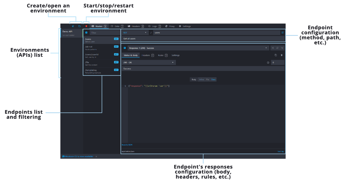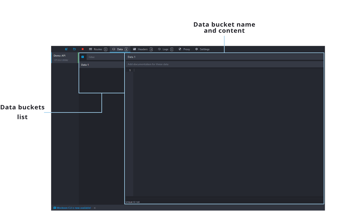 The data buckets view let you create and modify key-value stores that can be linked to route responses or used with the data helper. They are persisting between calls and can be regenerated by restarting the server.