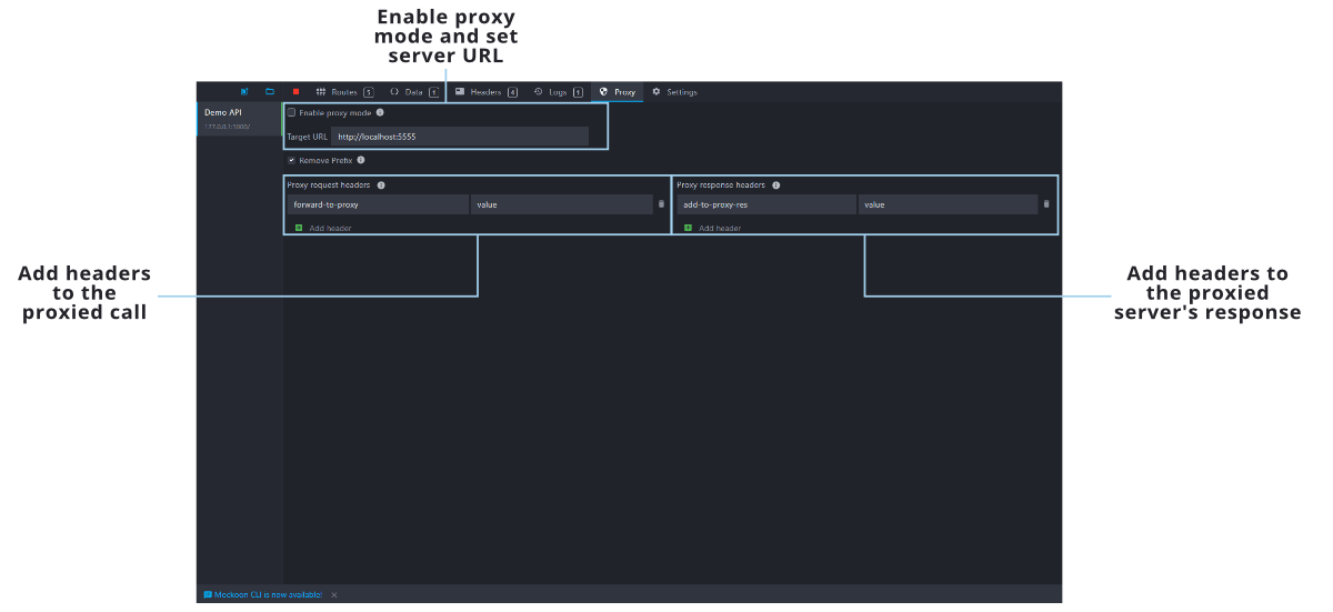 This view allows you to enable the proxy mode and modify its behavior: removing the API prefix, adding specific headers to the proxied server request or response, etc.