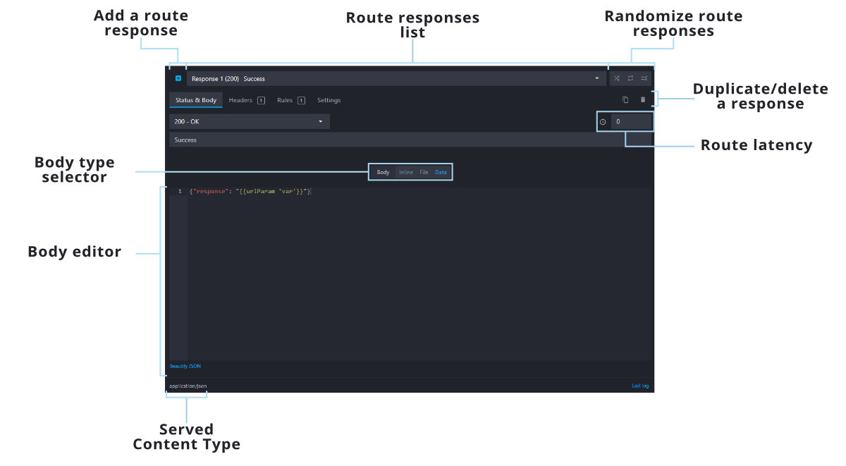 The endpoint's responses configuration (below) lets you manage each endpoint responses list and each response parameter: serving a file, a body, or a data bucket, with rules or not, etc.