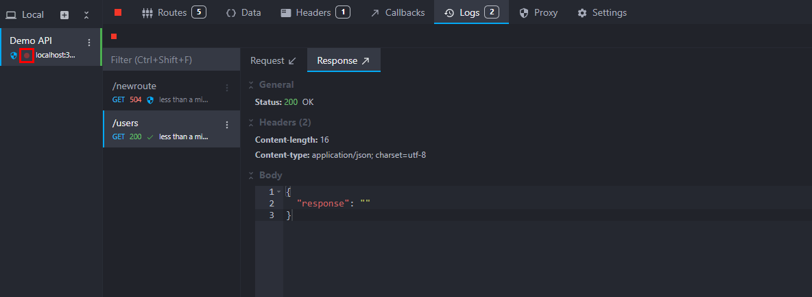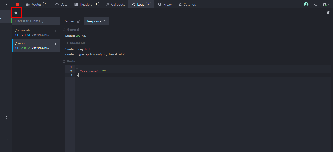 Mockoon can also automatically create mock API endpoints every time a request is logged. To activate this feature, click on the "Record" button at the top of the logs view: