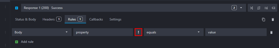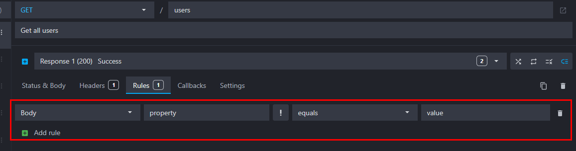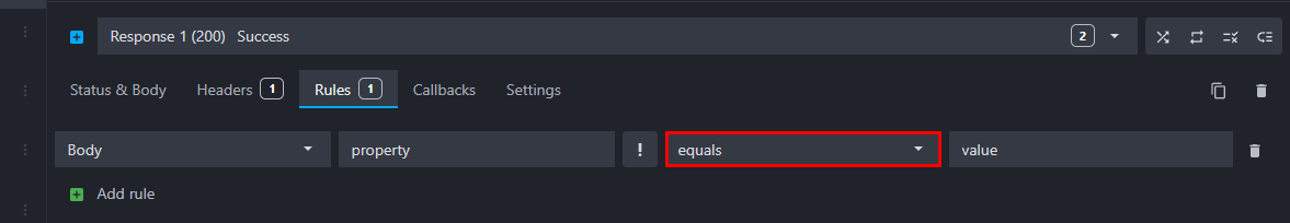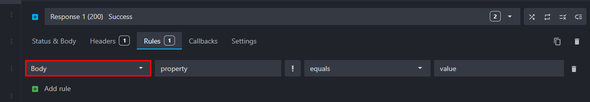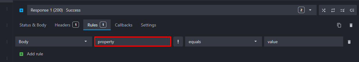 To add a new rule to a response, go to the route response's Rules tab, click on "Add rule" and fill the fields: