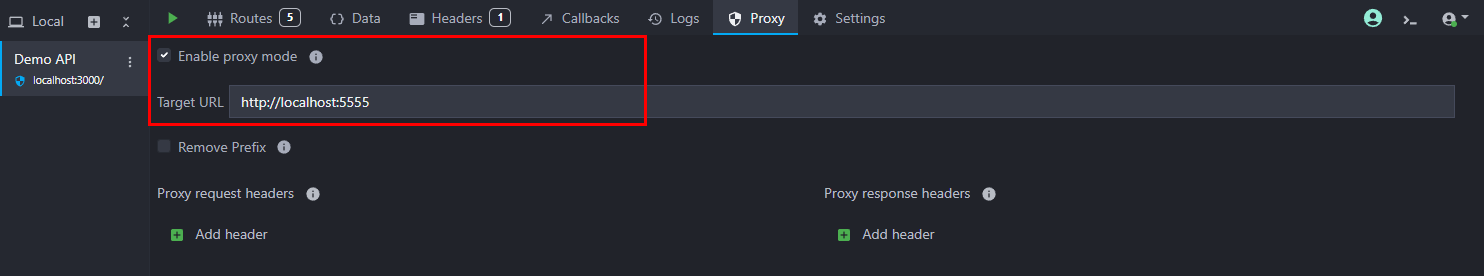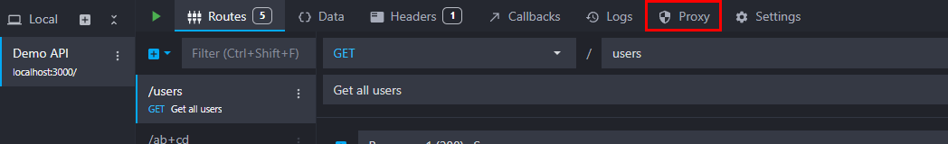 From now on, all routes that have been defined in Mockoon will be intercepted, and any other request not matching any route path will be forwarded to the server URL you entered in the proxy mode setting.