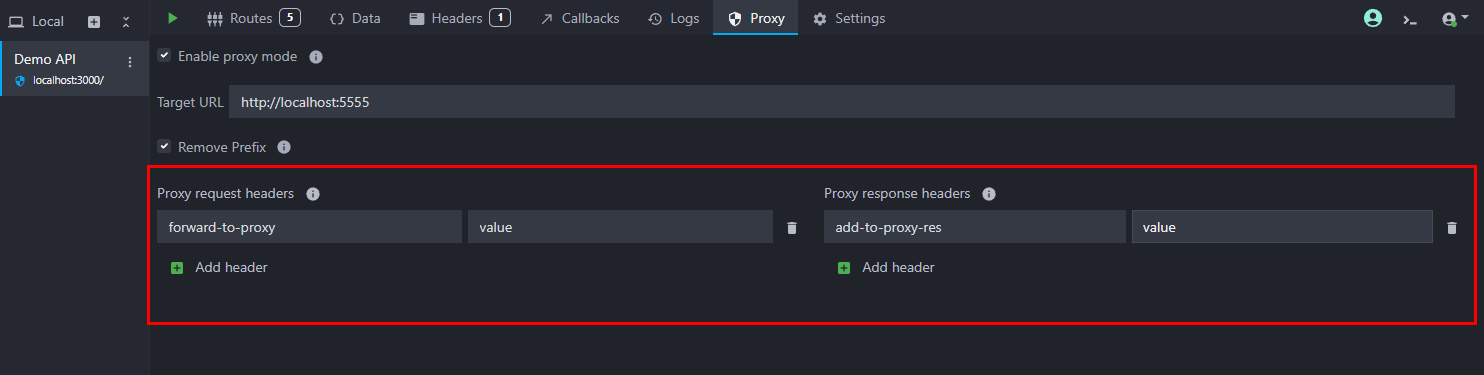 Proxy specific headers can also be added, both to the forwarded request and the response received from the target API.