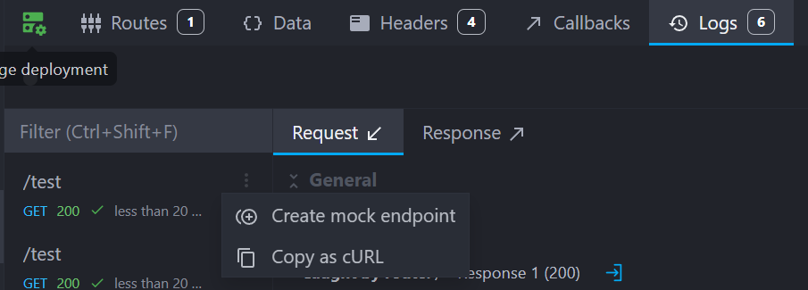 You can now copy a curl command from the logs tab to easily reproduce requests made to your mock APIs. Select "Copy as curl" from the log entry context menu to copy the command to your clipboard: