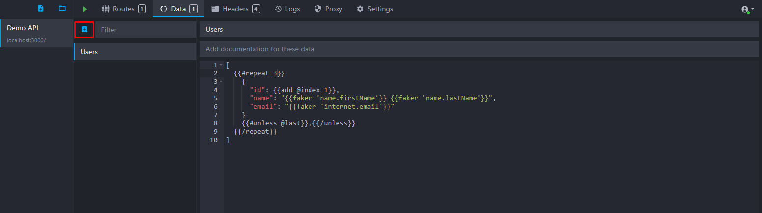 Add a new data bucket by clicking on the "plus" button and personalize your data bucket name and content on the right part of the screen. Here, we named it "Users" and added some JSON content with templating to generate three fake users at runtime: