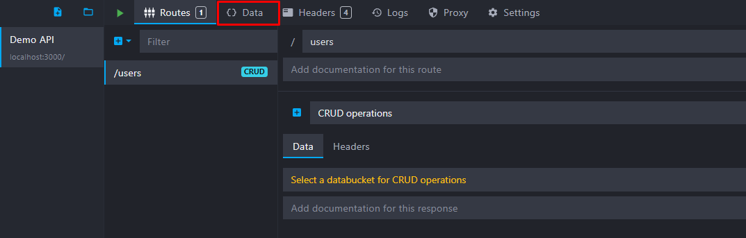 You may have noticed that the CRUD route is not linked to a data bucket yet, hence the "Select a data bucket for CRUD operations" message in the route response: