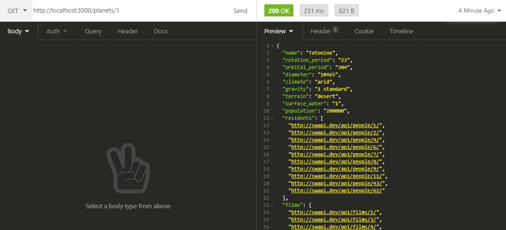 The Star Wars API does not have any character with an ID above 83, and we want to add a missing one with id number 90. As is, calling GET /people/90 would return a 404. So, we will be adding the following body to a new GET /people/90 route:
