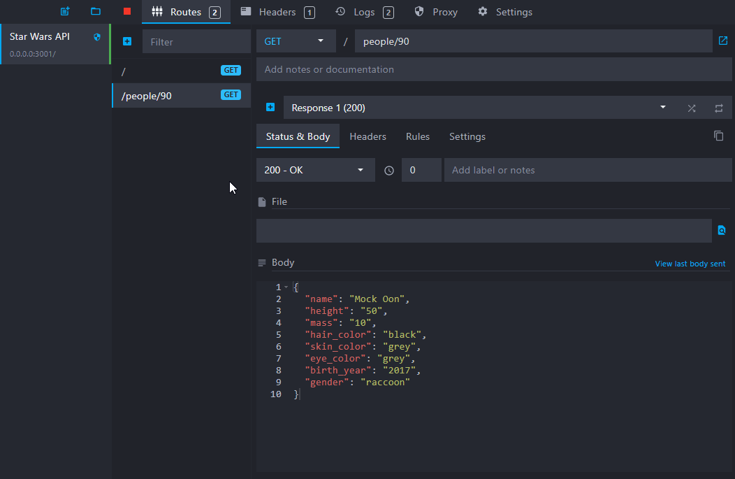 You can also call your custom endpoint GET /people/90 and see that Mockoon intercepted your call and returned the body you defined in your new route.