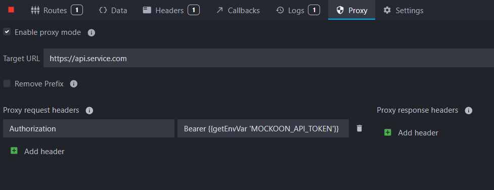 In your mock server, we will enable the proxy mode, point to the correct API endpoint (here, the endpoint is a fictive one), and use the getEnvVar helper to access the token and add it to an Authorization header: