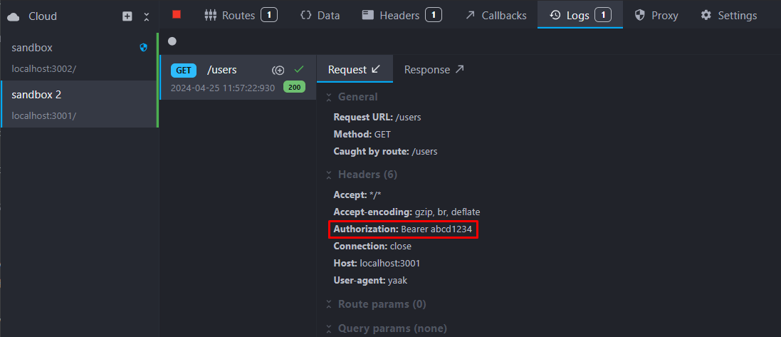 After making a call to our original mock server running on http://localhost:3002, we can inspect the forwarded request in the other instance and verify that the Authorization header is correctly set: